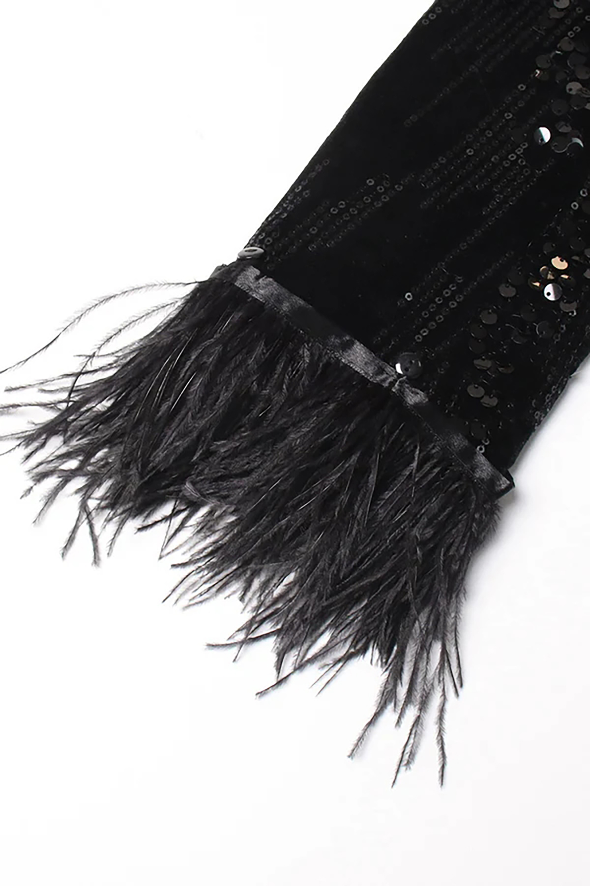 Silky Satin Lapel Feather Trim Long Sleeve Cinch Waist Sequin Party Blazer